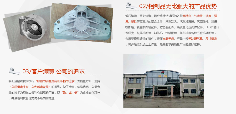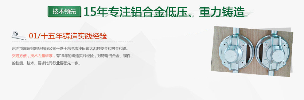 東莞市鑫鑄鋁制品有限公司坐落于東莞市沙田鎮大泥村委金和村金和路,交通方便,技術力量雄厚,有十五年的鑄造實踐經驗,對鑄造鋁合金、低壓制造、重力制造、技術、要求比同行業要領先一步。 本公司專業低壓鑄造、重力鑄造、翻砂鑄造鋁材質的各種高精密、氣密性、硬度、強度、塑性等高要求的鋁合金件,新能源汽車電機殼、端蓋、機器人關節臂、汽車缸頭、汽車減震器、汽摩配件、糾偏機郵箱、真空泵郵箱配件、防墜器配件、高質量馬達殼體配件、LED節能環保燈殼、鼓風機配件、鉆孔機、水塔配件、絲印機等各種五金機械配件,金屬型模具鑄造的鑄件,表面光滑無痕、產品內部無沙眼氣孔、尺寸精準,減少后續機加工工作量,是高要求高質量產品的最好選擇。我們且始終貫徹執行“顧客的滿意是我們永恒的追求”為質量方針,堅持“以質量求生存,以創新求發展”的原則。做工精細,價格優惠,以最專業的技術為您做出最稱心如意的產品,以“勤、誠、信”為企業文化精神,并沿著現代管理方向不斷向前推進。